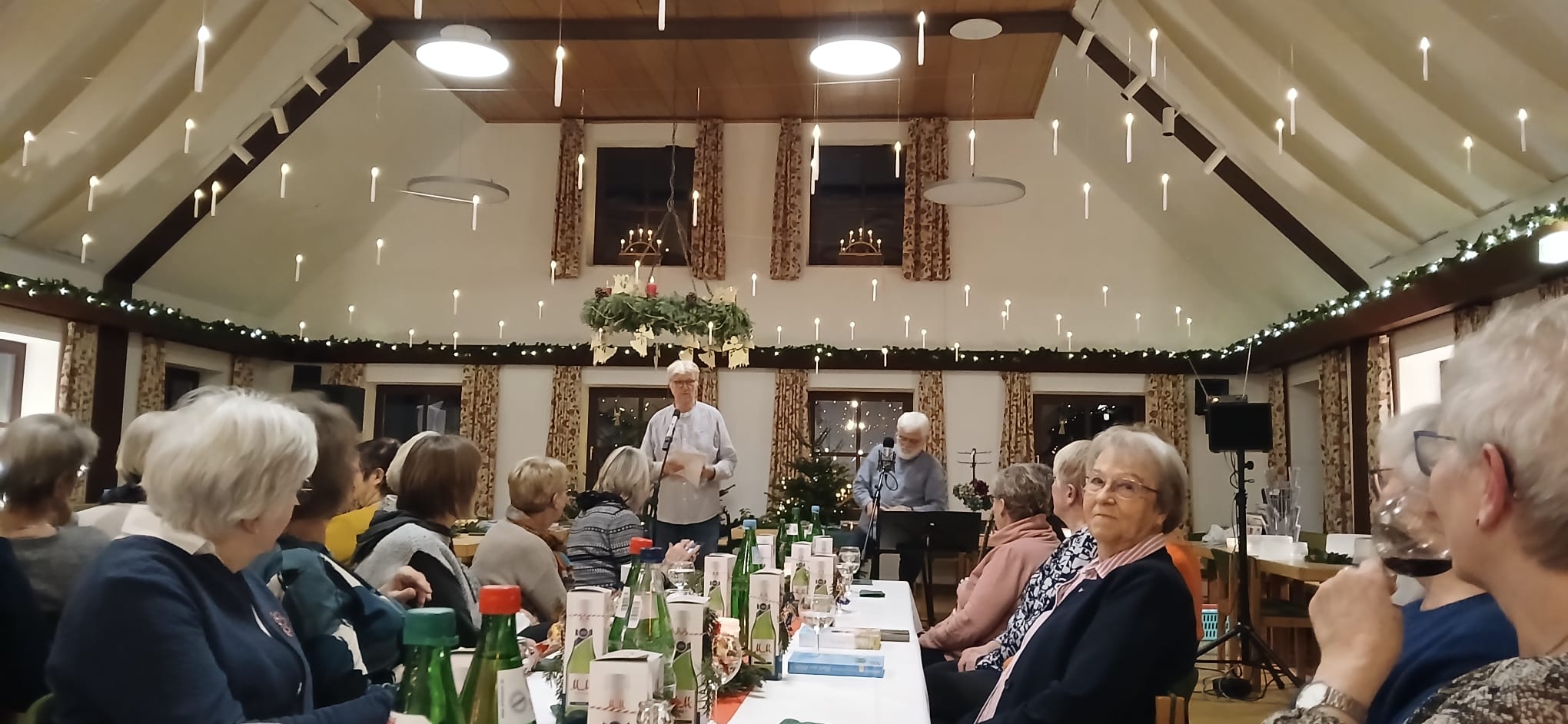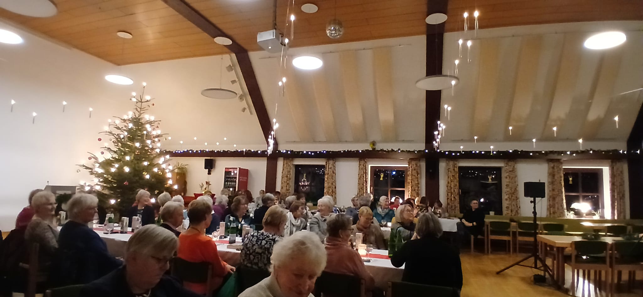 Der Saal war von Heinke und ihrem Team festlich geschmückt worden. Der große geschmückte Tannenbaum war wieder herrlich anzusehen und einige LandFrauen hatten den versteckten Apfel schnell gefunden. Die schwebenden Lichter über dem Saal gaben eine besondere Atmosphäre. Der Chef der Diakonieküche, Herr Müller, servierte uns ein leckeres Büfett: Geschnetzeltes von der Hähnchenbrust mit Paprika, Zwiebeln und Champignons in Rahmsoße mit Risi Pisi-Reis und gemischtem Salat, als Nachtisch gab es verschiedene Schichtdesserts im Glas.